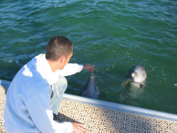 La prima delusione grande di Varadero arriva alla sera di questa prima giornata... Pappa, doccia, ci vestiamo e tutti contenti usciamo, convinti di trovare un qualcosa che assomigli al lungomare di Rimini o a via Bafile a Jesolo... ma una volta fuori dall'albergo ci troviamo spiazzati... il paesaggio assomiglia si ai luoghi sopracitati... ma a dicembre!!!! Il deserto più assoluto, non c'è anima viva manco a pagar oro!!!! E siamo sulla strada principale di Varadero... Facciamo 2 passi in cerca di qualcosa ma troviamo... il nulla! Torniamo così dopo una luuuunga passeggiata in albergo e per tutta la settimana non ci resta che goderci il mare in assoluta calma e tranquillità... solitaria! In pratica il turismo di Varadero dicono sia sceso molto e le persone che troviamo in giro sono generalmente coppie e per di più di una certa età... :/ Il mare dal canto suo non è assolutamente male e offre decisamente begli scenari E degli ottimi fondali, dei quali per ovvi motivi non ho foto... ma ne parlerò più avanti... Scopriamo intanto che il villaggio turistico offre alcuni (pochi per la verità) svaghi, e così tutti i giorni alle 15.30 vado al "corso di spagnolo" con l'animatrice Mirelis dopo la spiaggia e prima della doccia un' pò di palestra con gli di attrezzi che ci sono nella palestrina dell'hotel... La tipa del tour operator ci offre delle escursioni a pagamento e tra le tante scegliamo quella che con un catamarano andremo a Cayo blanco, nel tragitto ci sarà la possibilità di fare un bagno con i delfini, fare snorkeling, free bar nel catamarano e il pranzo al ristorante di cayo blanco. Dovevamo andare lunedì, ma l'escursione viene rinviata a martedì per maltempo. Martedì ci informiamo e ci dicono che si parte, nonostante in cielo ci siano delle nuvolaZZe nere ben poco promettenti e un ventaZZo freddo che poco si concilia con il tipo di escursione... però han deciso che si parte quindi... L'escursione prende una piega abbastanza brutta sin dall'inizio, il sole non esce e il vento permane... insomma... fa un freddo BESTIA!!!!! e abbiamo freddo nonostante addosso abbiamo delle felpe... Durante il viaggio in catamarano le nuvole si spostano, facendo fuoriuscire il sole, il quale però ci mette un bel po di tempo prima di cominciare a scaldare l'aria... e il vento freddo resta... ci avviciniamo alla zona dove ci sono i delfini e più impavidi (crucchi con qualche birra sullo stomaco per la maggioranza) si spogliano per andare a fare il bagno... scendiamo dall'imbarcazione e controllo un attimo la temperatura dell'acqua che effettivamente PARE calda (però l'ho tastata con le mani congelate...) ma il problema non è tanto il bagno in se... è quando si esce bagnati...!!! Vabè, facciamo comunque un po di conoscenza con questi simpatici pescioni...